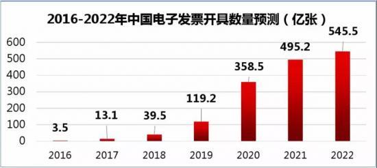 根据智研咨询的数据,2017年我国电子发票开具张数达到了13.1亿张,2018年预计将达到39.5亿张,后续将维持高速增长,预计2022年这个数字将达到惊人的545.5亿张,如下图(来源:智研咨询):